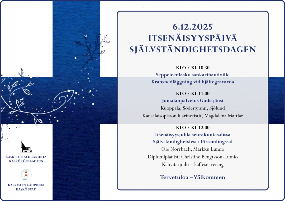 6.12. På självständighetsdagen kransnedläggning vid hjältegravarna kl. 10.30, tvåspråkig gudstjänst i kyrkan kl. 11 och därefter kaffe och självständighetsfest i församlingssalen.